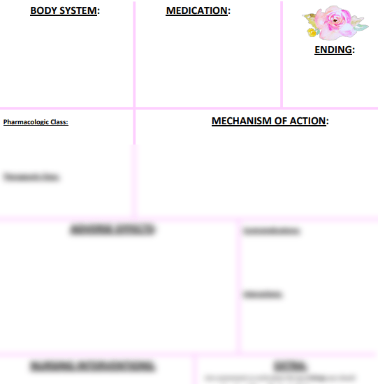 Study guide containing all the most important aspects of psychiatric nursing pharmacology. 7 Pages * Every page is decorated with drawings that are perfect for helping you remember all the information you NEED to know (and make your notes cute)! Topics Included: * Anatomy of the brain * Neurotransmitters * Anti-anxiety and hypnotic drugs * […]